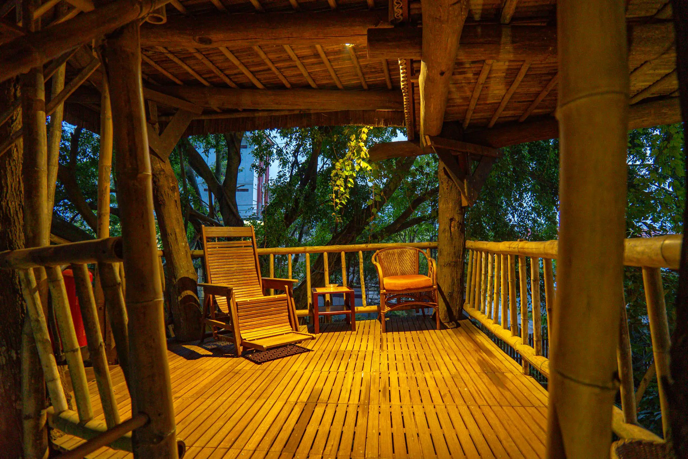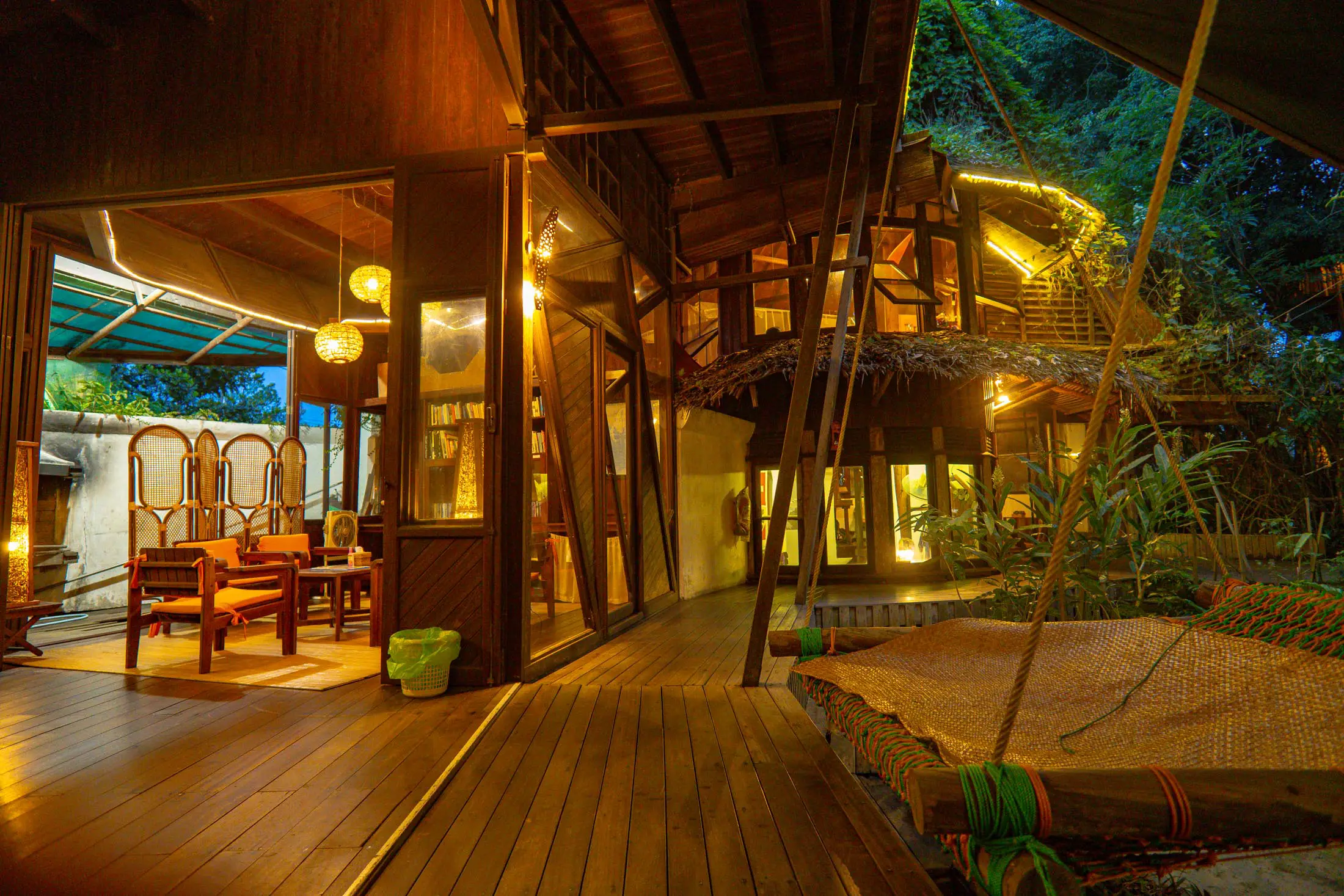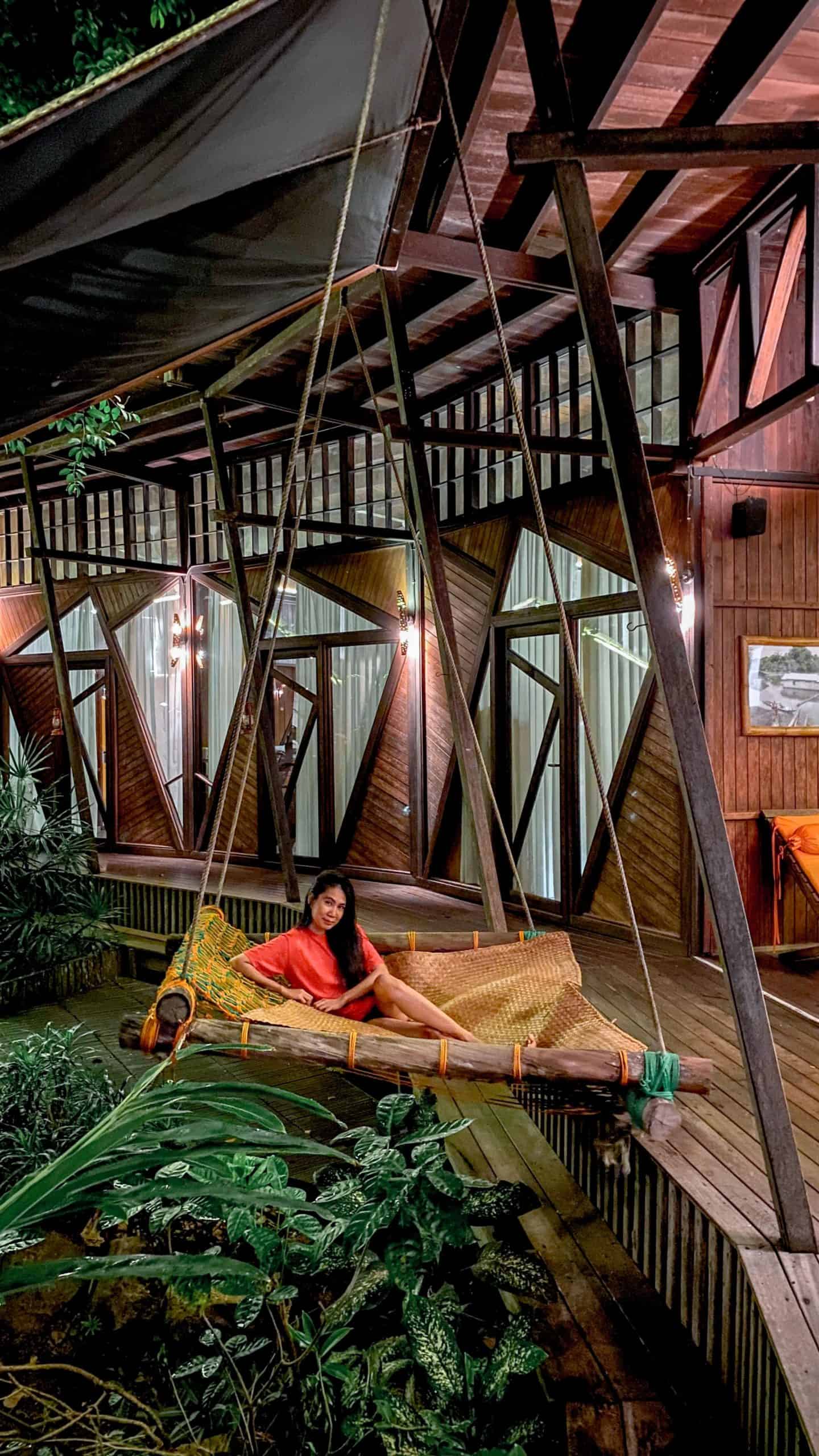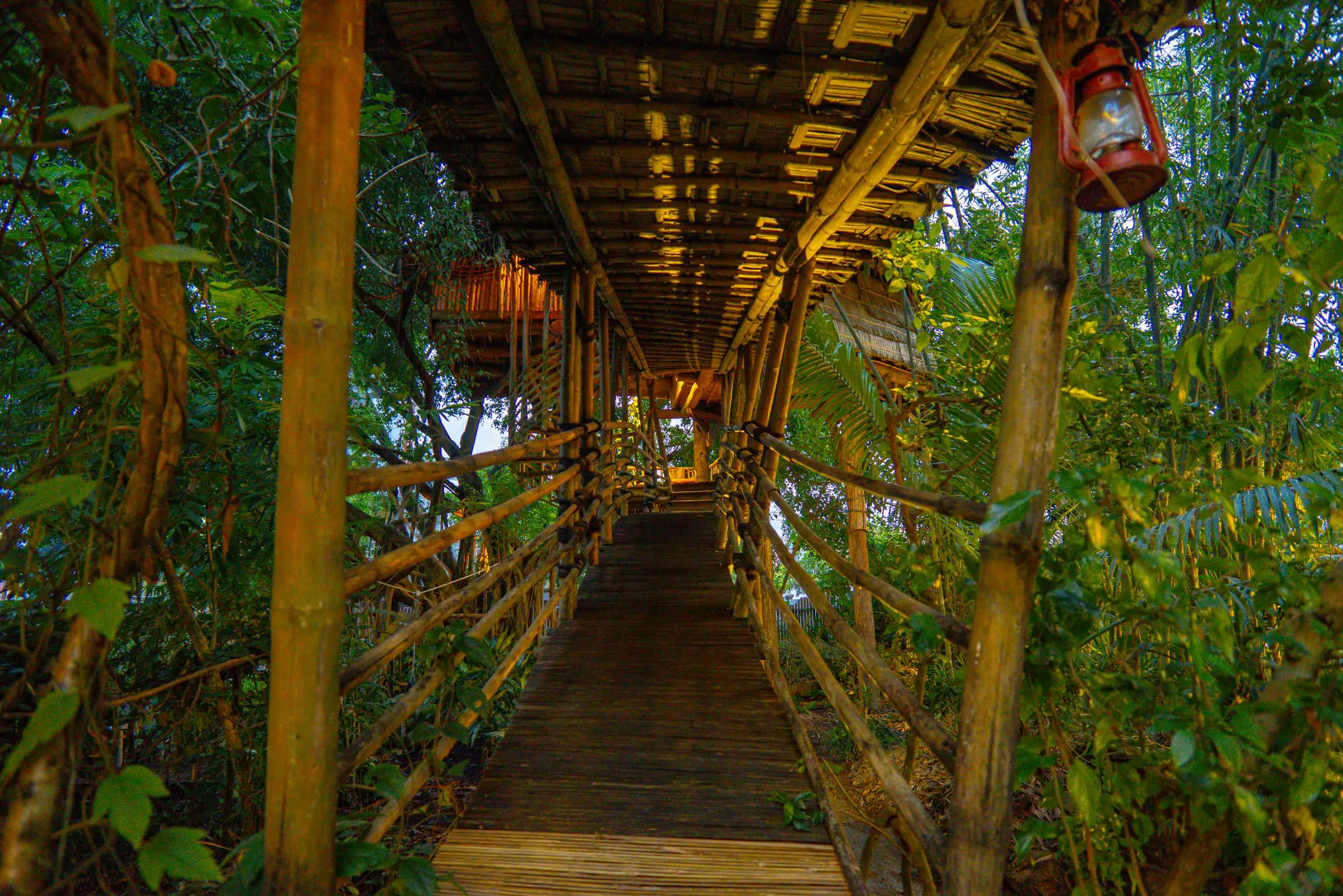 The covered gallery on the ground floor leads to three standard double rooms with their unique wooden architecture and a curved grass roof for a naturally cool climate. The public lounge with a barbecue area and natural swimming pool leads to the special snail house, “Rumah Keong.” But that’s not all! A naturally curved bamboo bridge leads to the exotic tree house. The tree house epitomizes the tropical lifestyle and is generally very popular with guests.