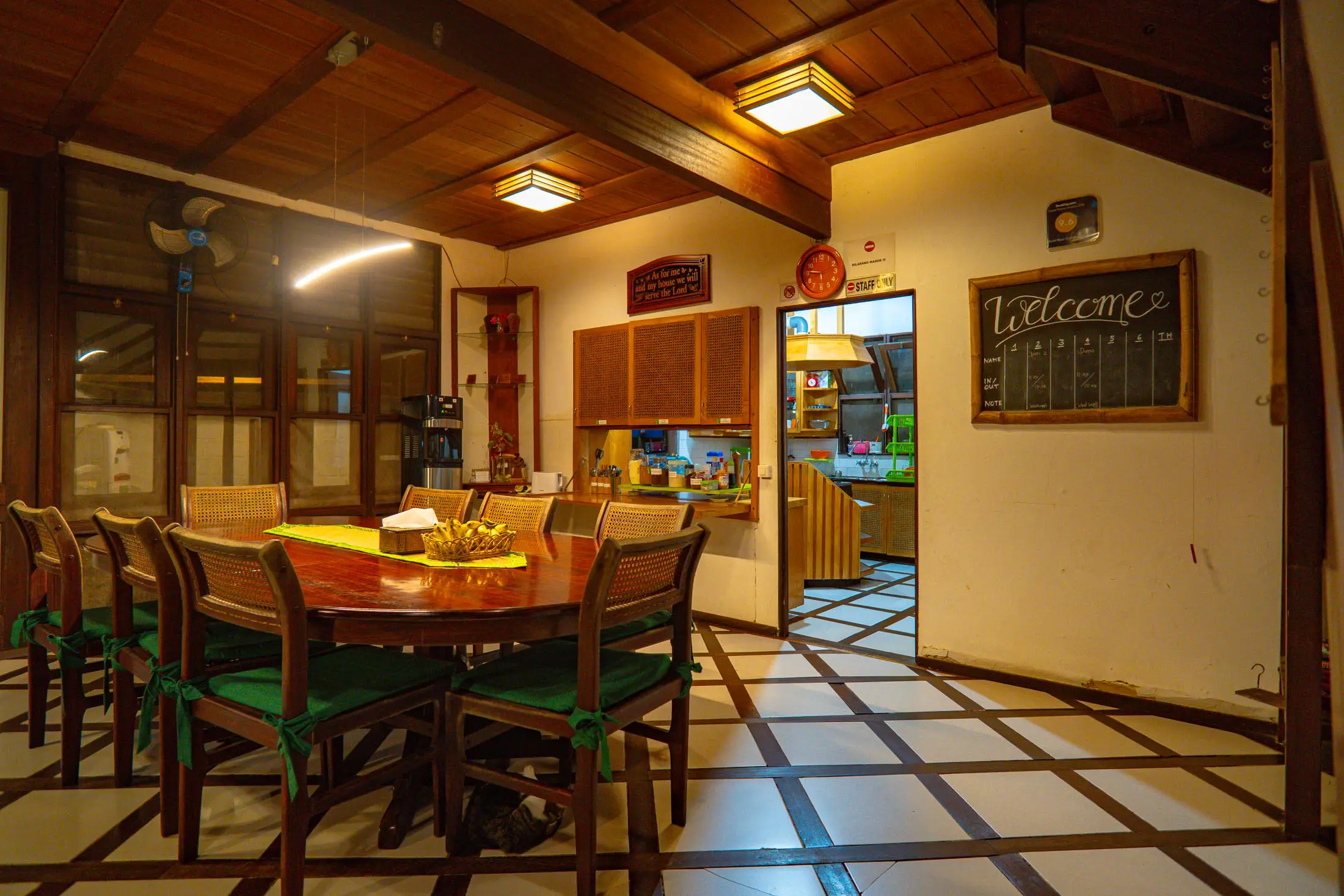 After passing the garage and the main entrance, the public part of the guesthouse, including the dining room, invites you to enjoy a cold welcome drink – our famous “Teh Serai” (lemongrass tea).
