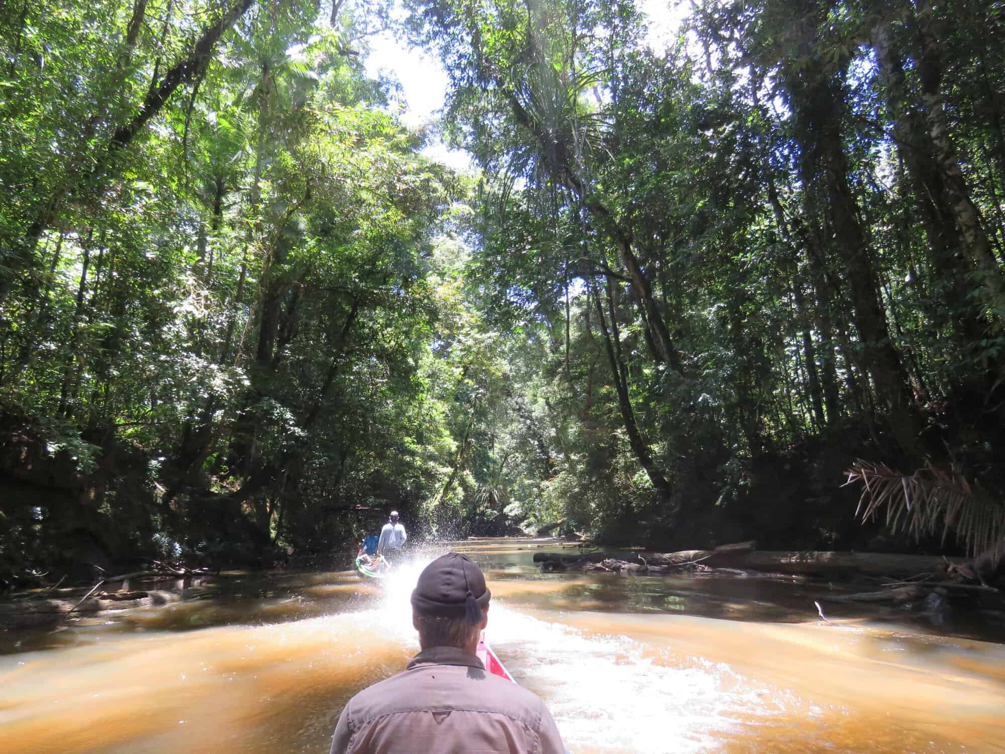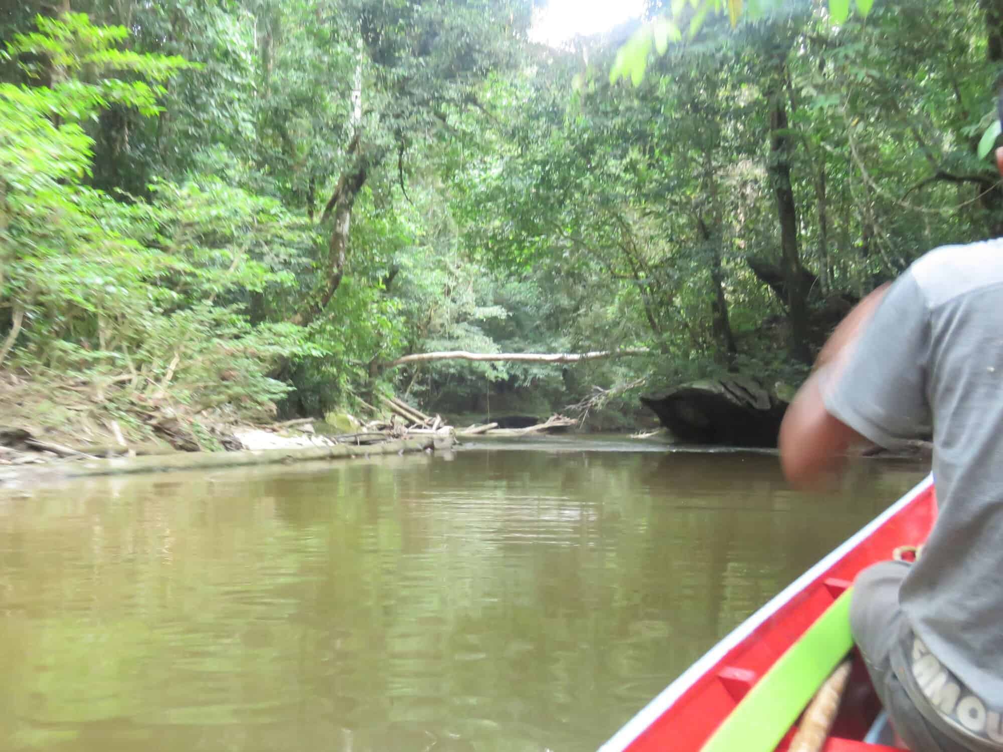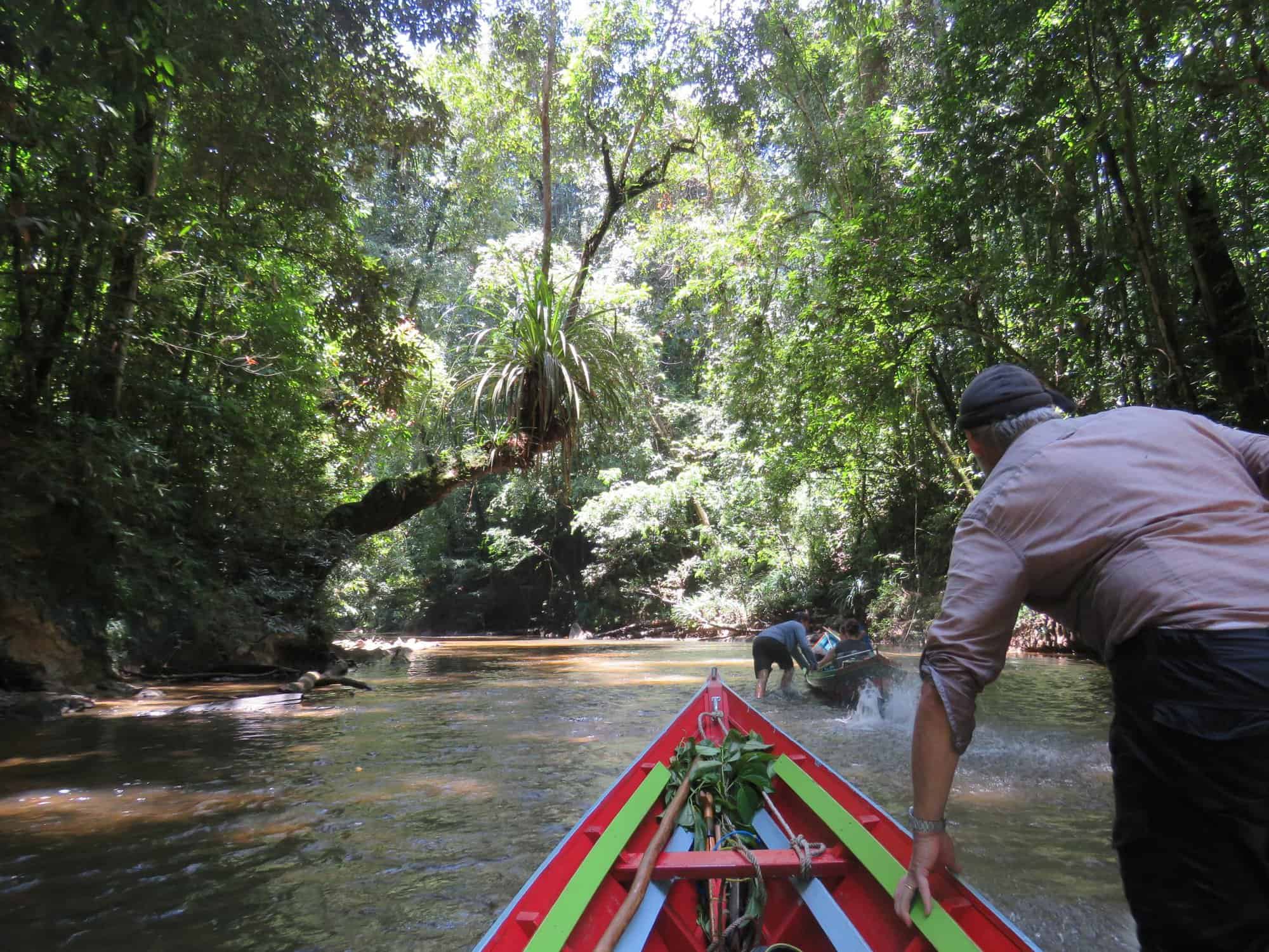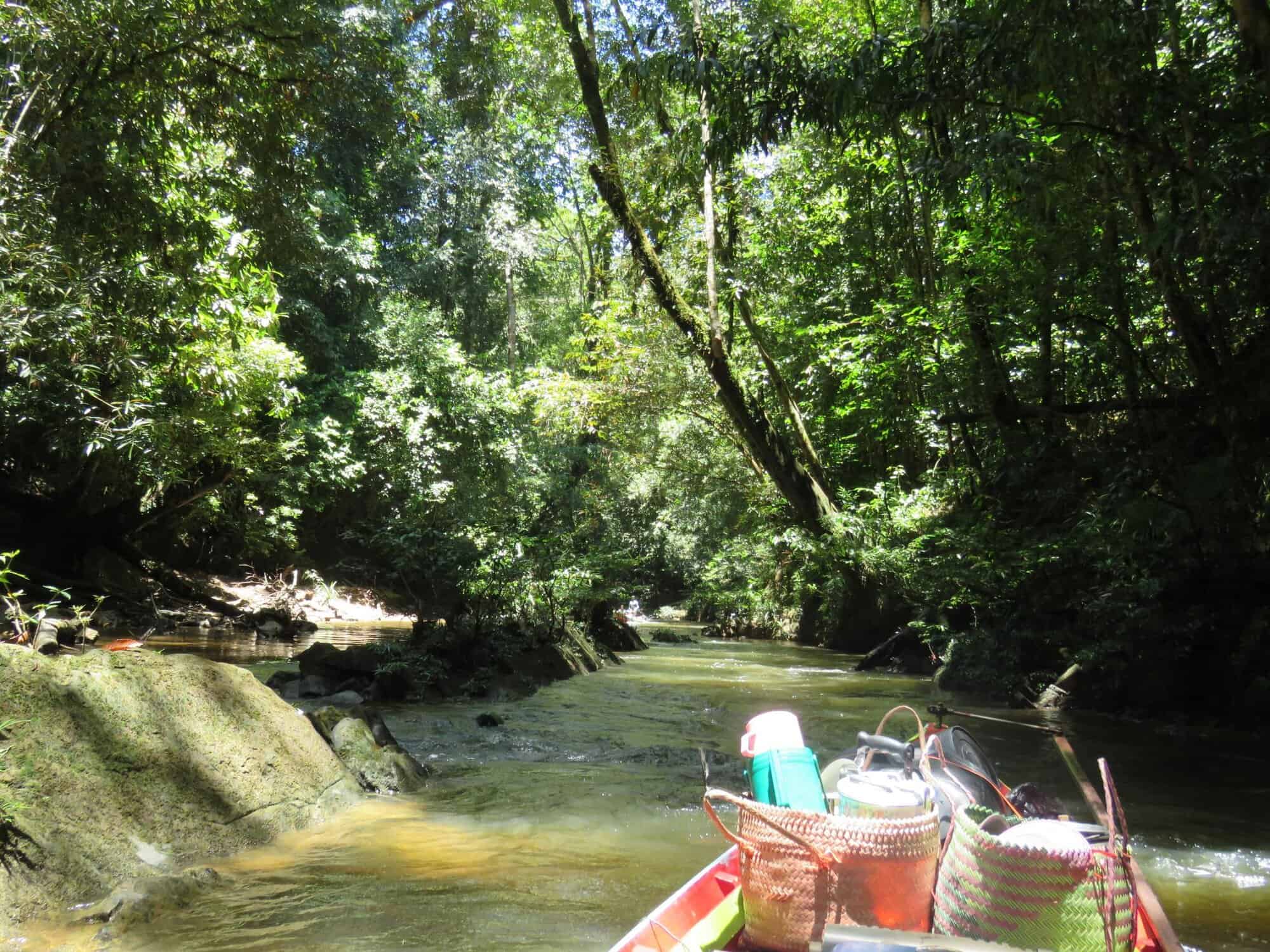 The journey to the Joloi Valley is already an unforgettable experience. But the real jungle tour begins on the second day. We choose small, motorized canoes, per 2 guest we need one so called “Jis”. We travel upstream for a long time, upriver, deeper and deeper into the jungle. At the beginning, trees line the banks, and you’re still exposed to the hot tropical sun right at the equator. The further you venture into the outback, the more the trees close the canopy over the river, and you travel through the jungle like a tunnel. The watercourse narrows, and you must navigate around rocks, trees, and sandbanks in the riverbed. Later, the river becomes so small that the boat repeatedly runs aground, especially tree trunks and branches of large trees lying in the riverbed, obstructing free passage. Depending on the water level, you must get out of the boat repeatedly, push, pull, and sometimes walk short distances in the water. After a long day, rocks and a few small huts come into view. We are now close to “Villa Corona.”.