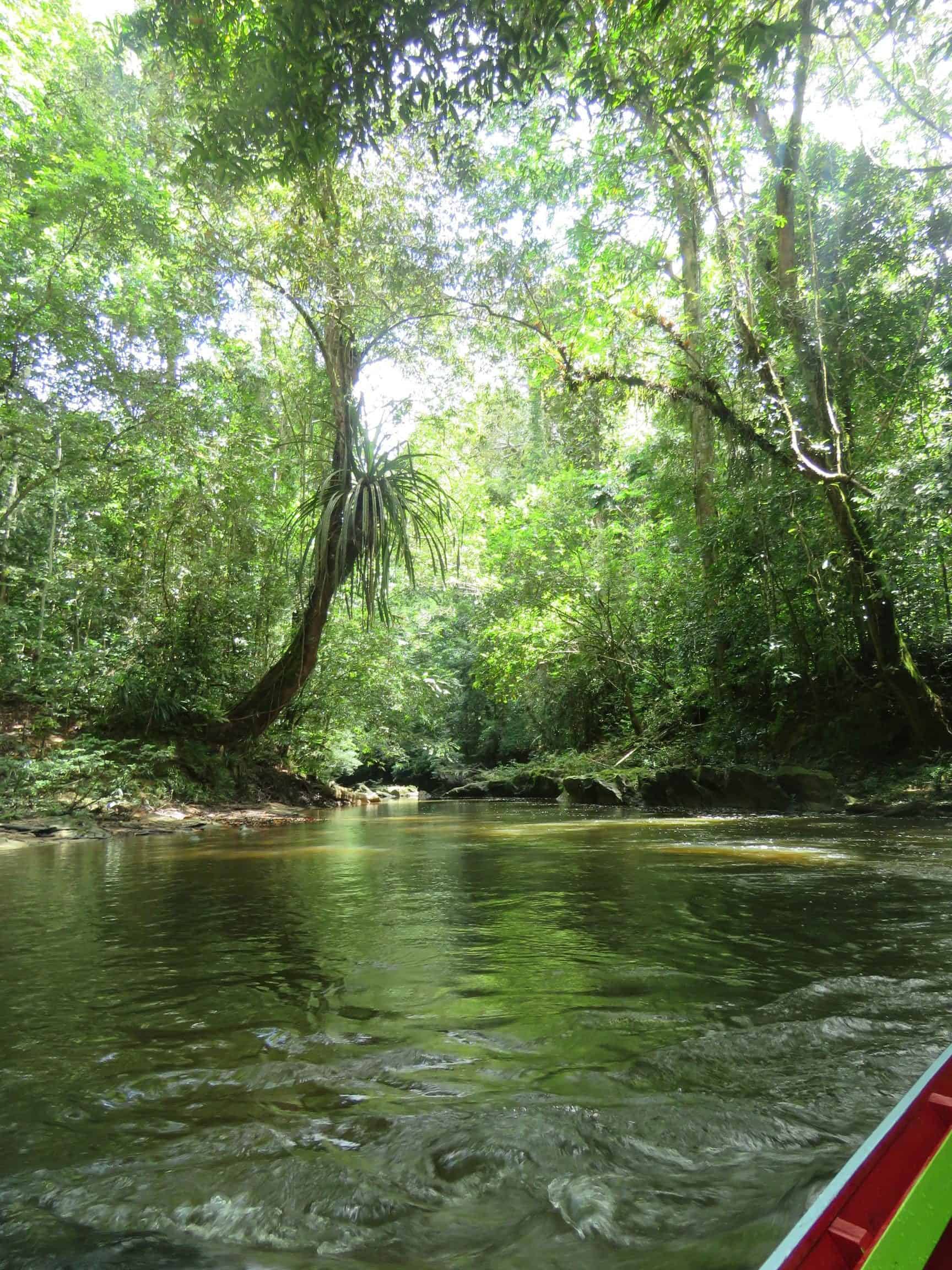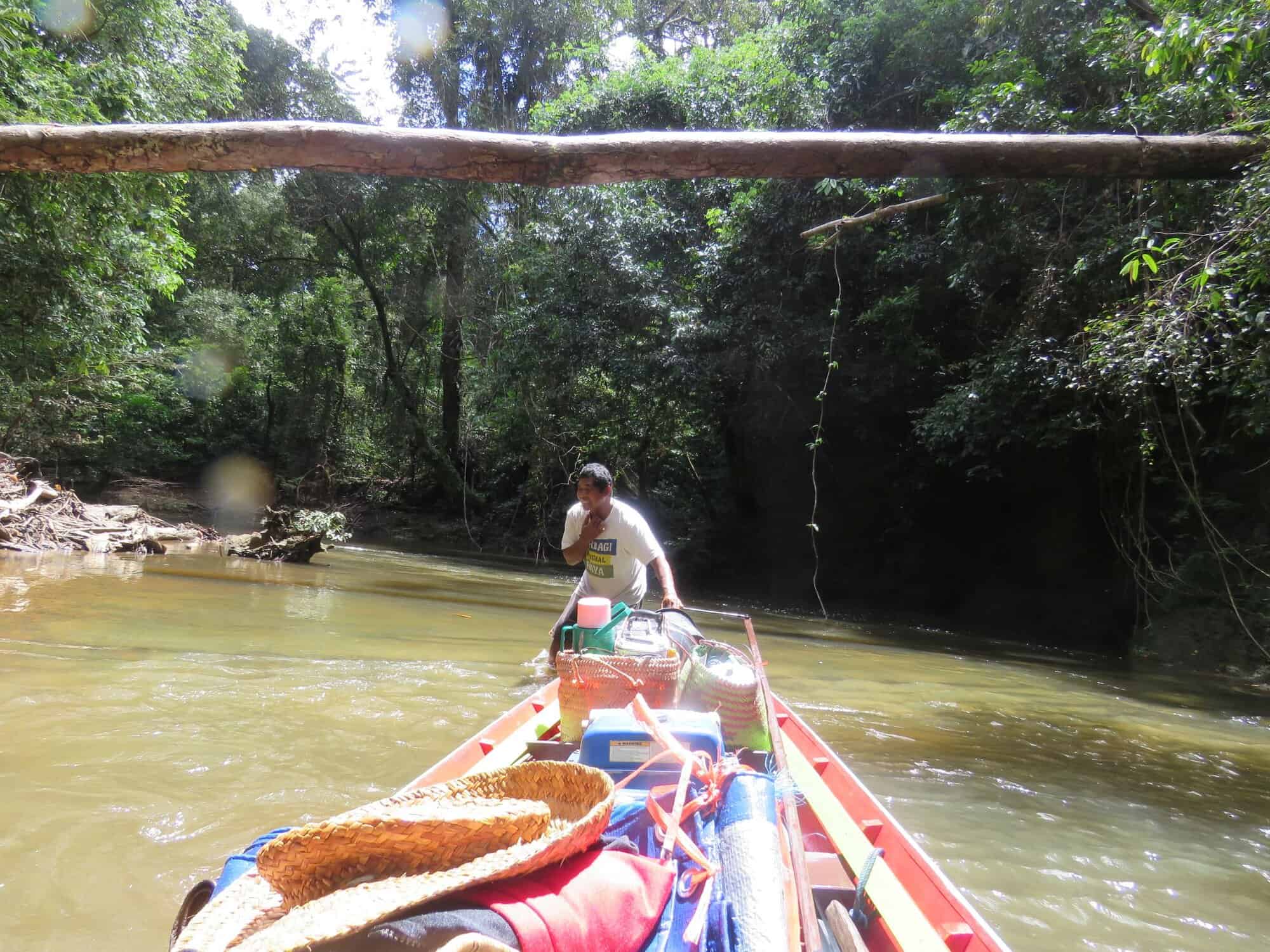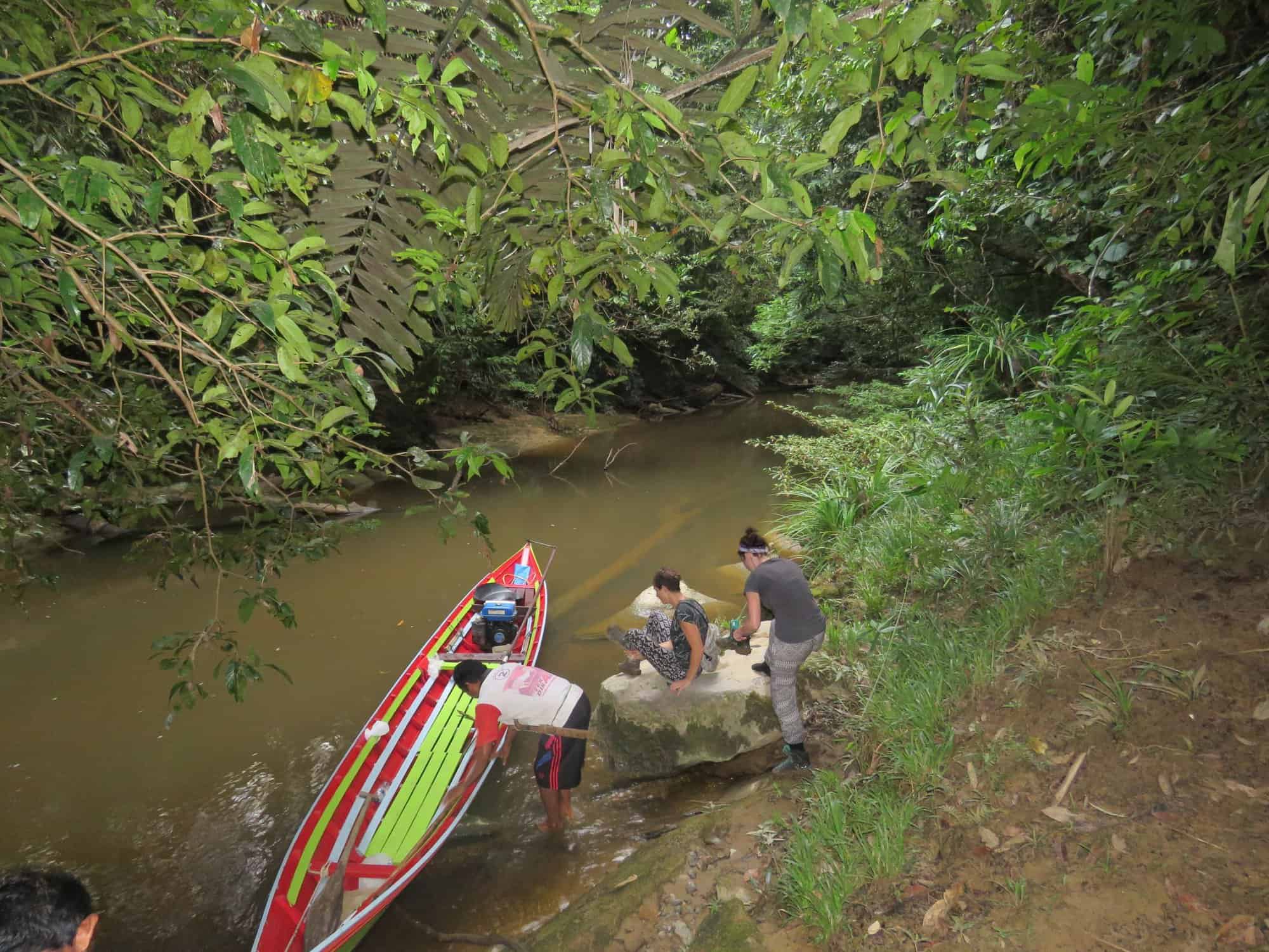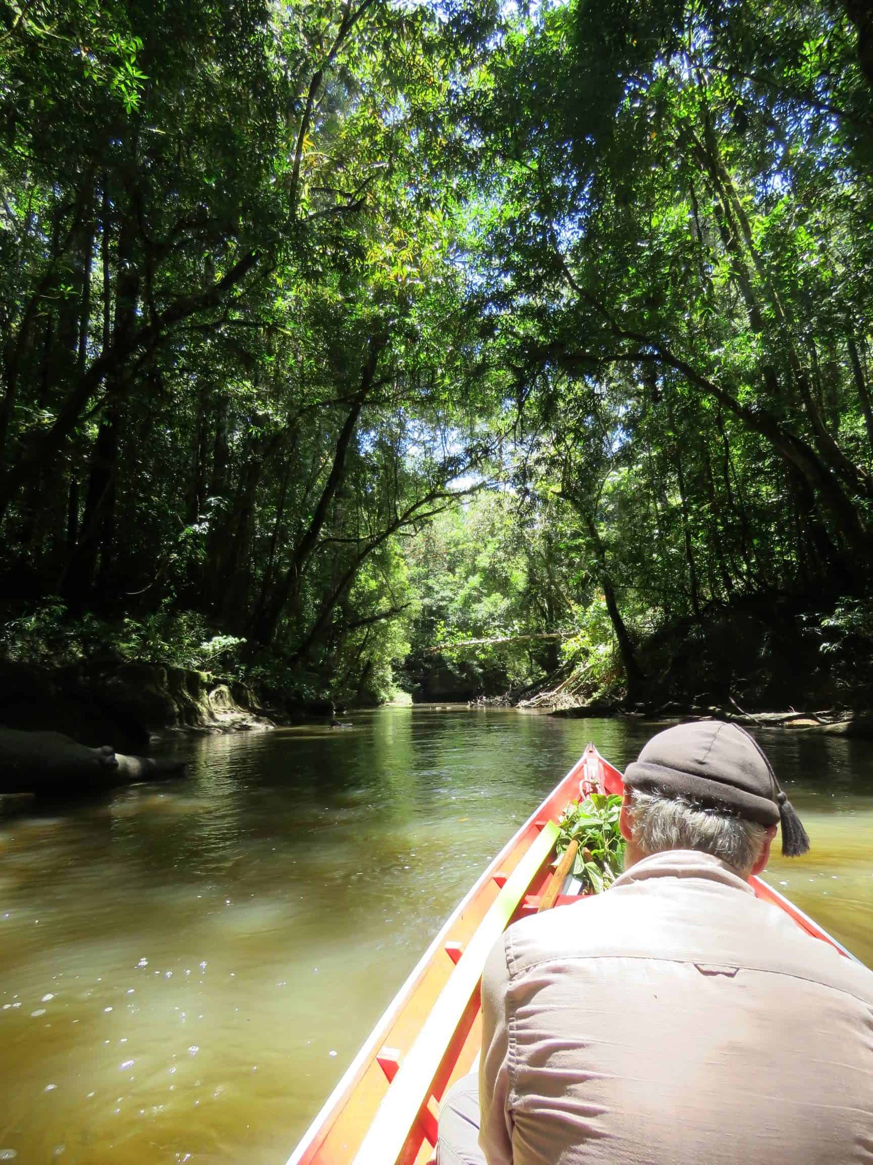 The journey to the Joloi Valley is already an unforgettable experience. But the real jungle tour begins on the second day. We choose small, motorized canoes, per 2 guest we need one so called “Jis”. We travel upstream for a long time, upriver, deeper and deeper into the jungle. At the beginning, trees line the banks, and you’re still exposed to the hot tropical sun right at the equator. The further you venture into the outback, the more the trees close the canopy over the river, and you travel through the jungle like a tunnel. The watercourse narrows, and you must navigate around rocks, trees, and sandbanks in the riverbed. Later, the river becomes so small that the boat repeatedly runs aground, especially tree trunks and branches of large trees lying in the riverbed, obstructing free passage. Depending on the water level, you must get out of the boat repeatedly, push, pull, and sometimes walk short distances in the water. After a long day, rocks and a few small huts come into view. We are now close to “Villa Corona.”.