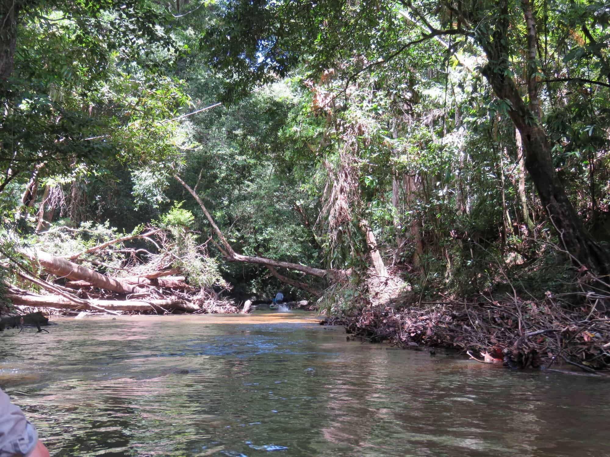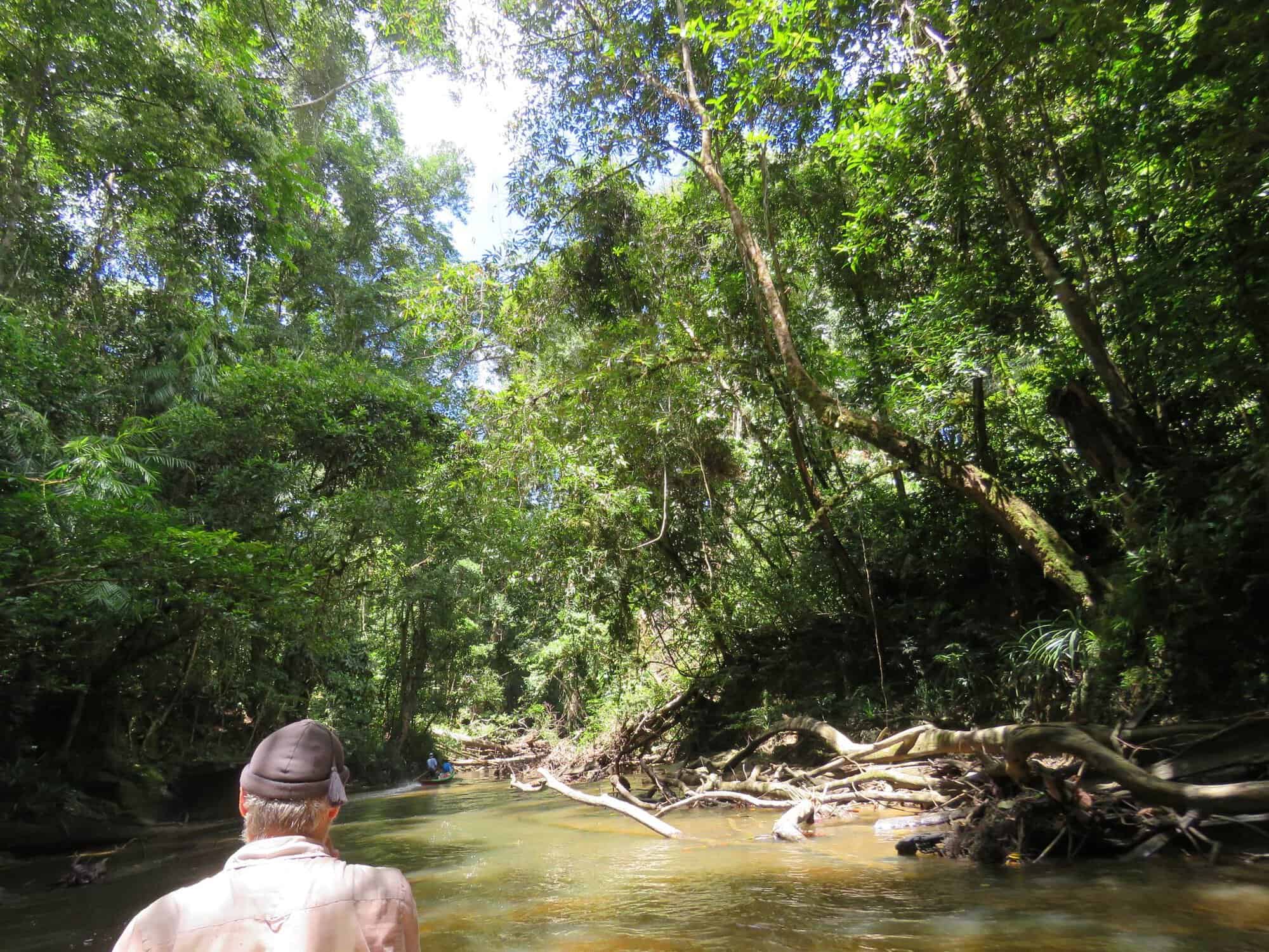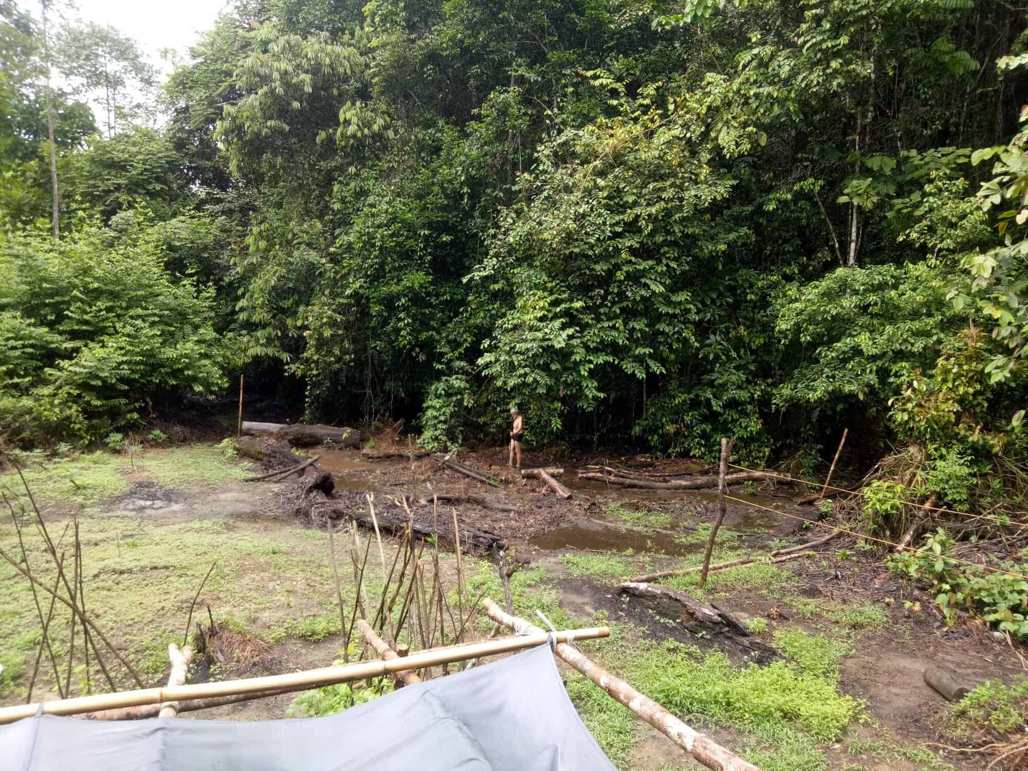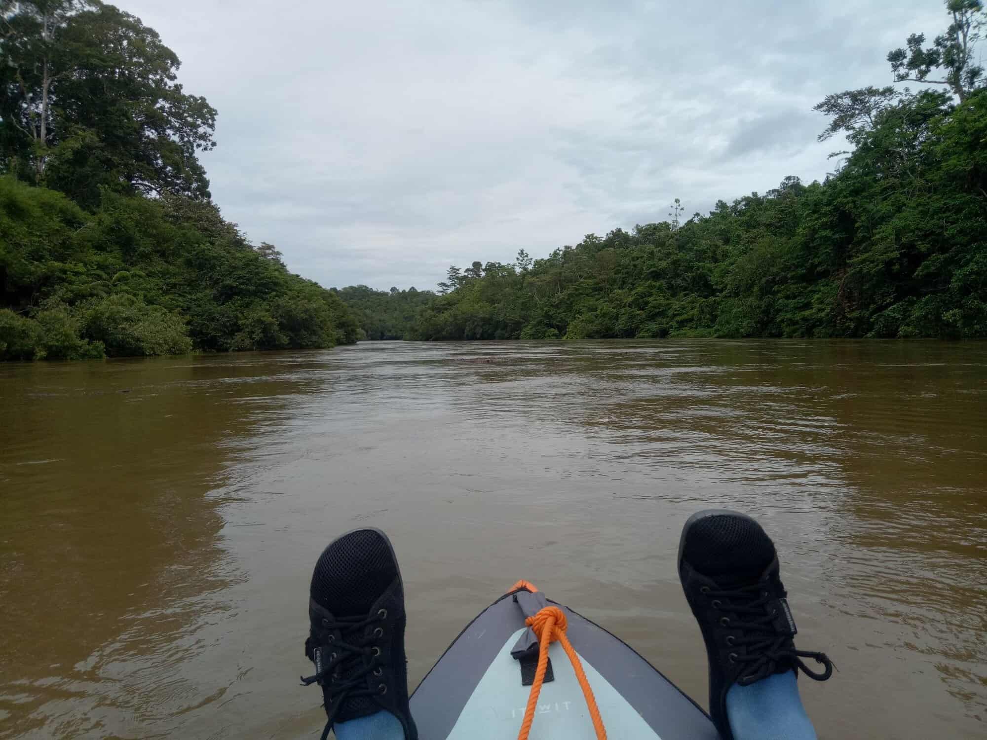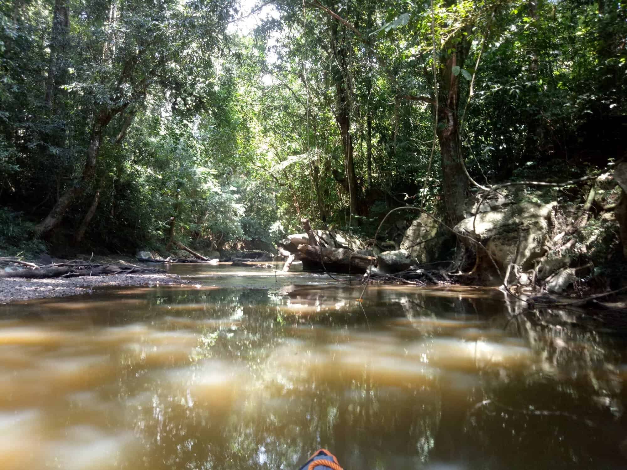 The journey to the Joloi Valley is already an unforgettable experience. But the real jungle tour begins on the second day. We choose small, motorized canoes, per 2 guest we need one so called “Jis”. We travel upstream for a long time, upriver, deeper and deeper into the jungle. At the beginning, trees line the banks, and you’re still exposed to the hot tropical sun right at the equator. The further you venture into the outback, the more the trees close the canopy over the river, and you travel through the jungle like a tunnel. The watercourse narrows, and you must navigate around rocks, trees, and sandbanks in the riverbed. Later, the river becomes so small that the boat repeatedly runs aground, especially tree trunks and branches of large trees lying in the riverbed, obstructing free passage. Depending on the water level, you must get out of the boat repeatedly, push, pull, and sometimes walk short distances in the water. After a long day, rocks and a few small huts come into view. We are now close to “Villa Corona.”.