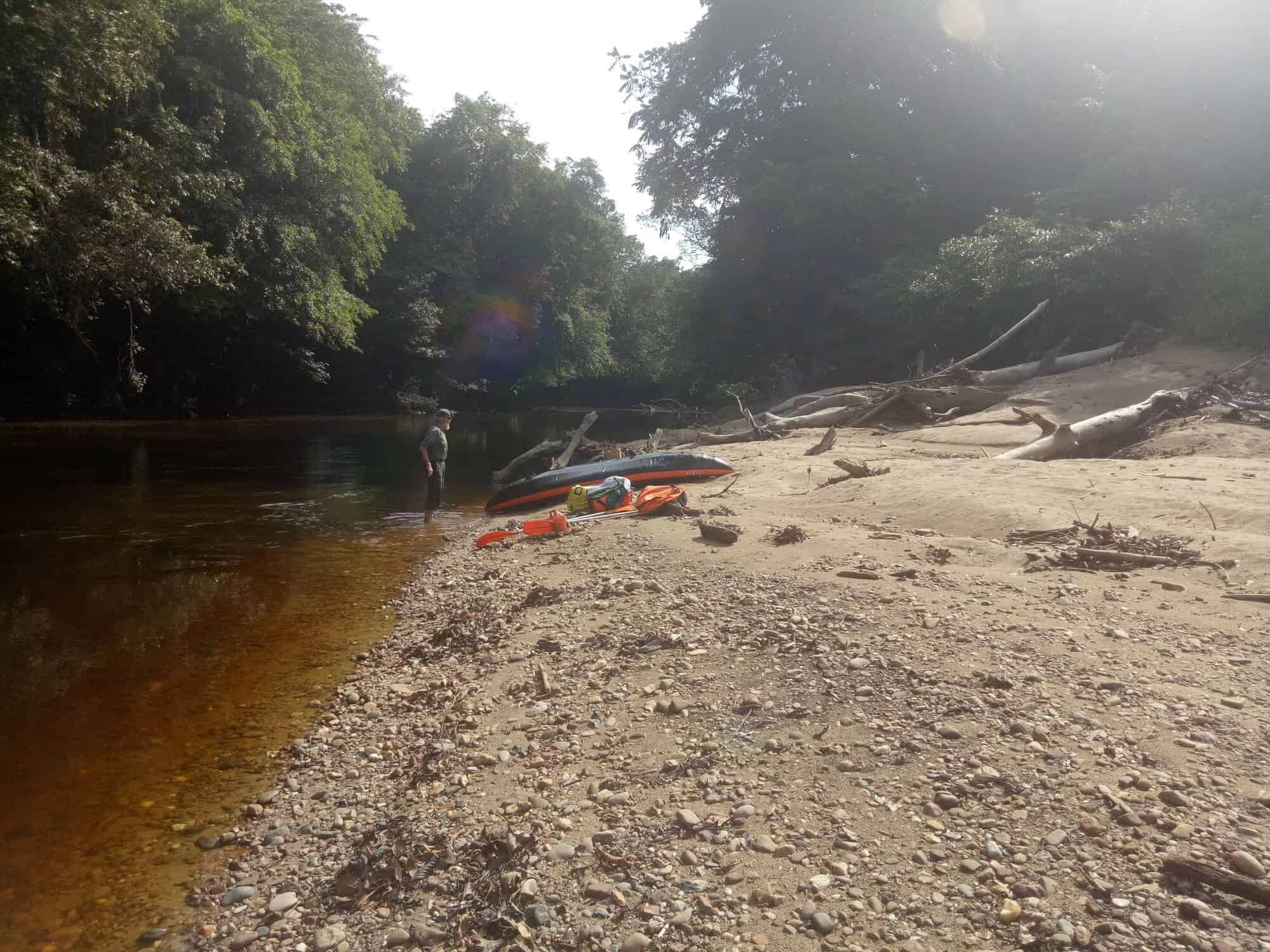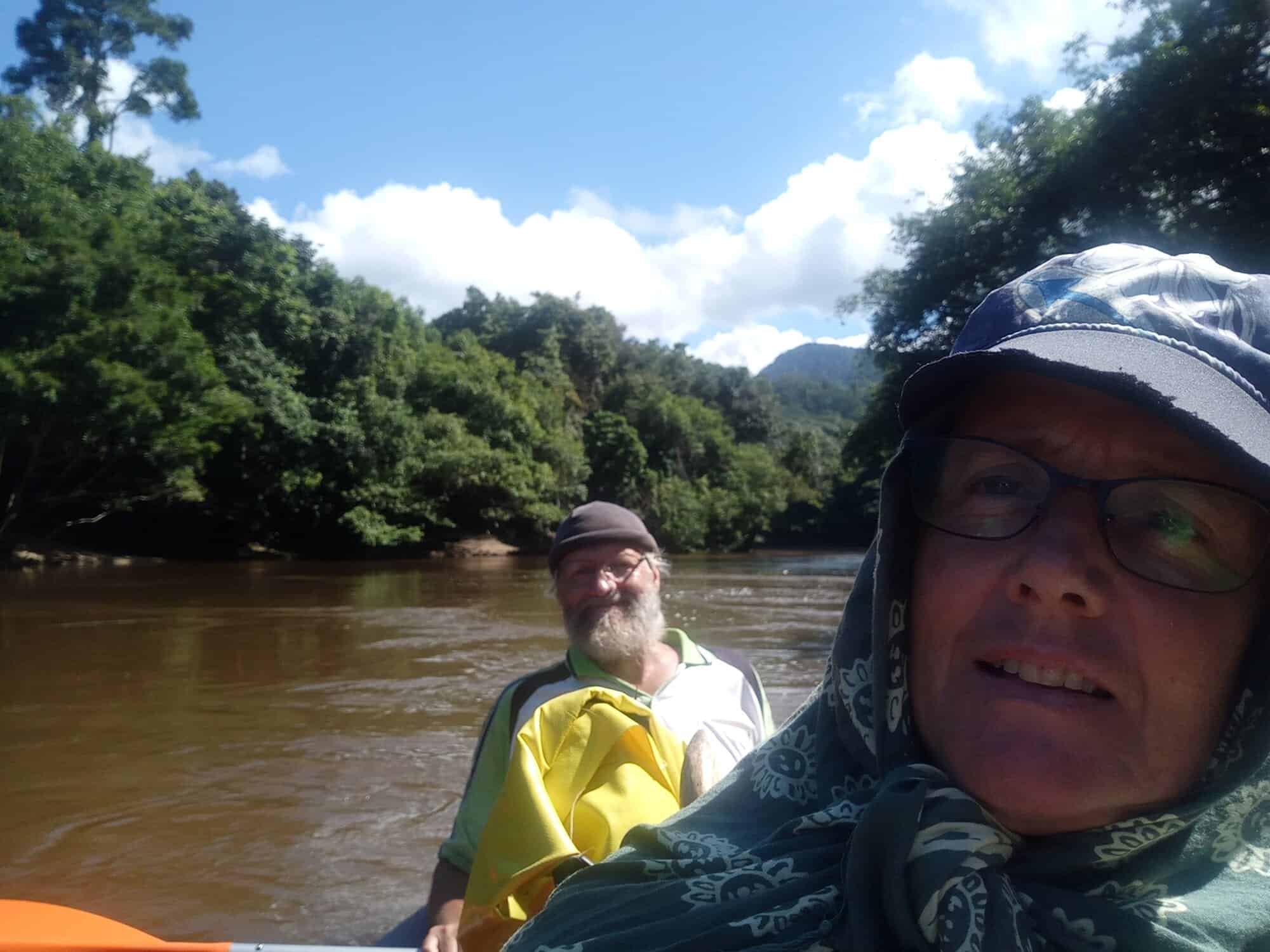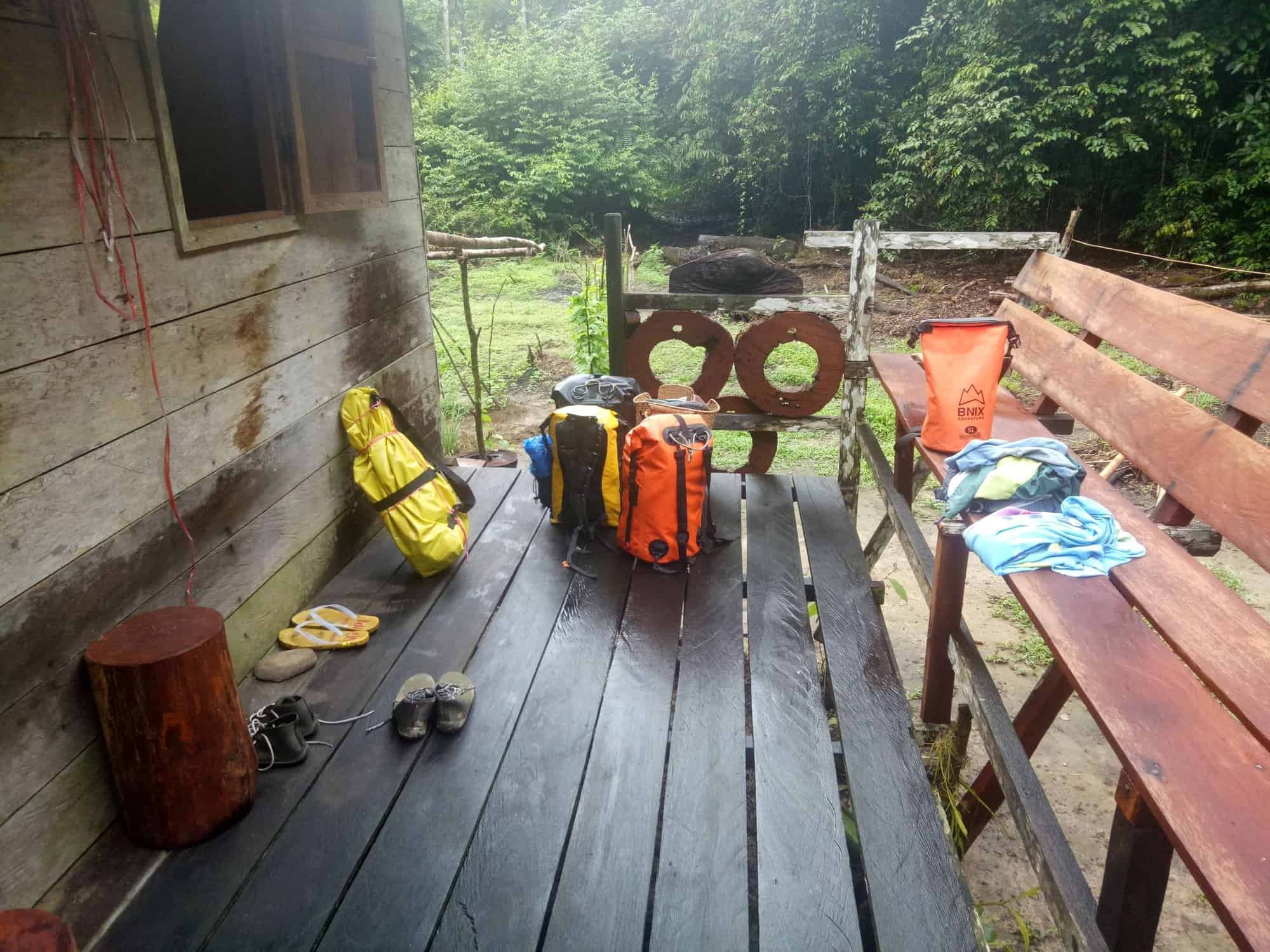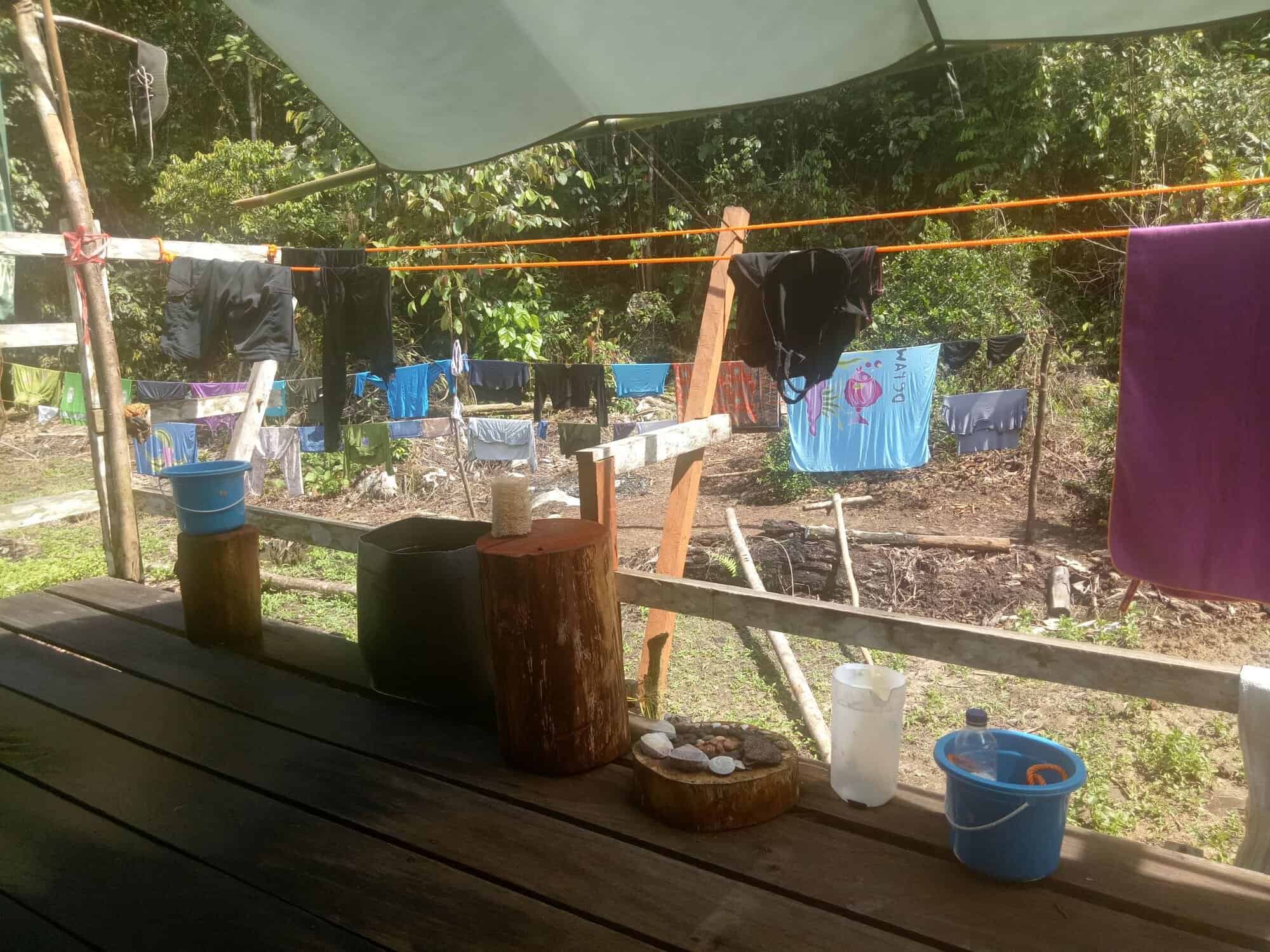 The journey to the Joloi Valley is already an unforgettable experience. But the real jungle tour begins on the second day. We choose small, motorized canoes, per 2 guest we need one so called “Jis”. We travel upstream for a long time, upriver, deeper and deeper into the jungle. At the beginning, trees line the banks, and you’re still exposed to the hot tropical sun right at the equator. The further you venture into the outback, the more the trees close the canopy over the river, and you travel through the jungle like a tunnel. The watercourse narrows, and you must navigate around rocks, trees, and sandbanks in the riverbed. Later, the river becomes so small that the boat repeatedly runs aground, especially tree trunks and branches of large trees lying in the riverbed, obstructing free passage. Depending on the water level, you must get out of the boat repeatedly, push, pull, and sometimes walk short distances in the water. After a long day, rocks and a few small huts come into view. We are now close to “Villa Corona.”.