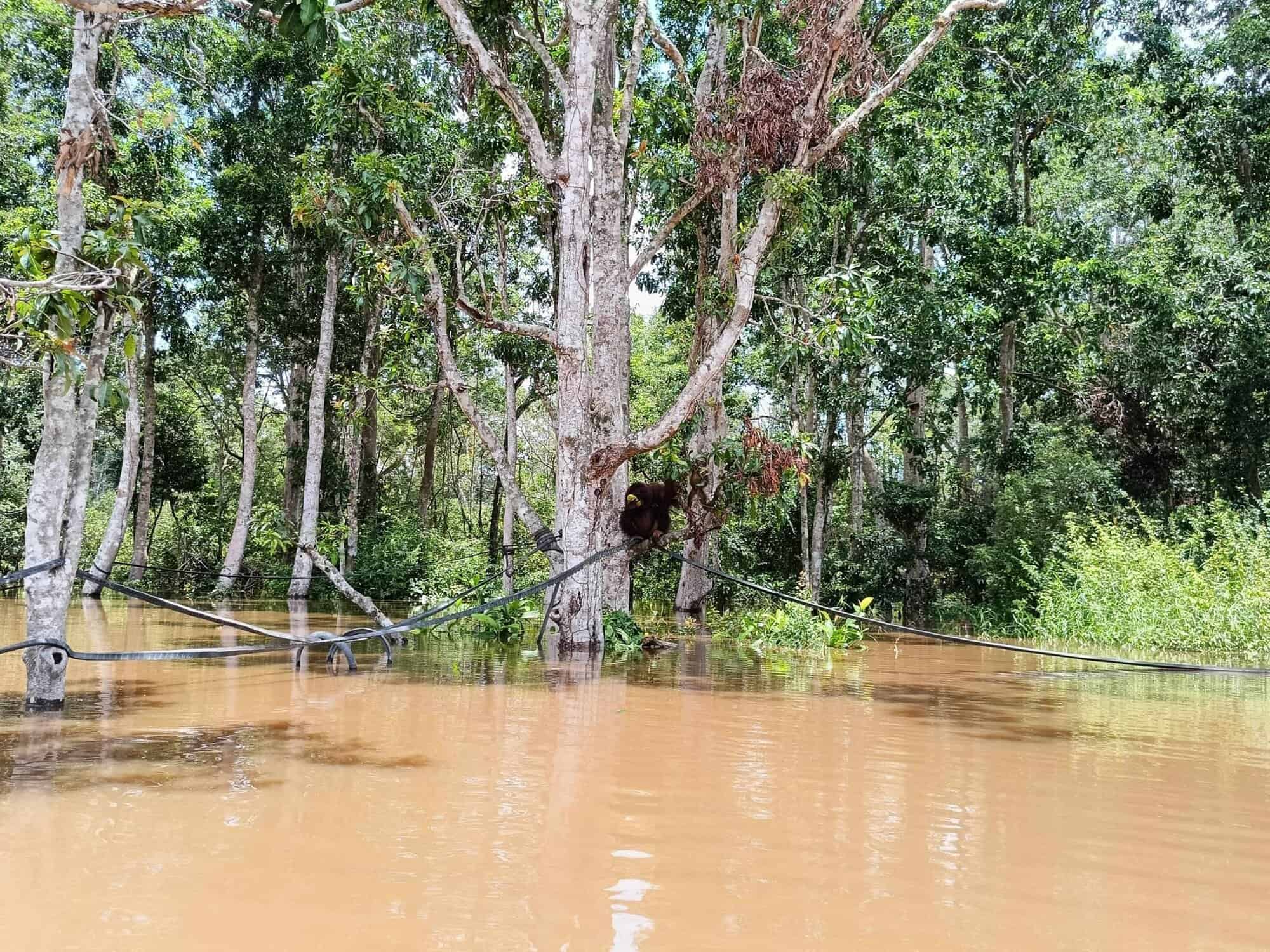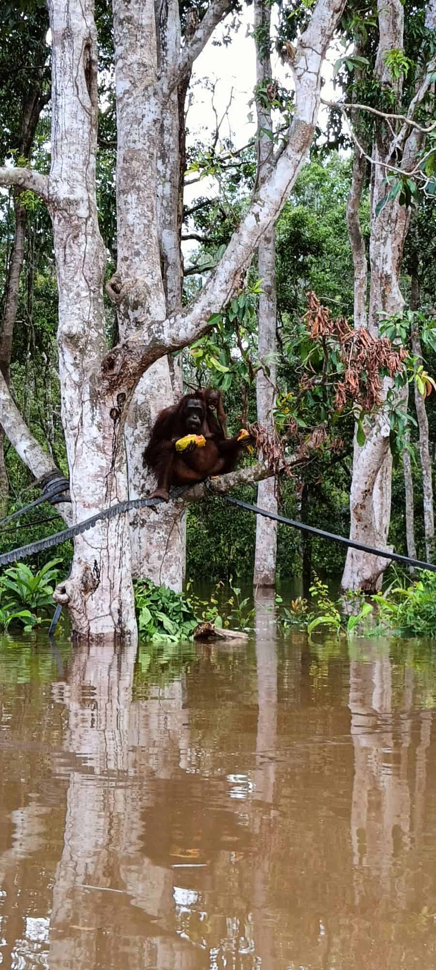 At “Pulau Kaja”, close to the village of Sei Gohong, approx. 35 km outside of Palangka Raya, you can visit semi wild Orang Utan on a so called “pre-release” island surrounded by waters of the Rungan River. The primates are semi-wild and fed every day by the BOS rangers, some of them are in “training” to be released later back into the wild, some others will probably grow old there, because they cannot being released into the wild due to several reasons.